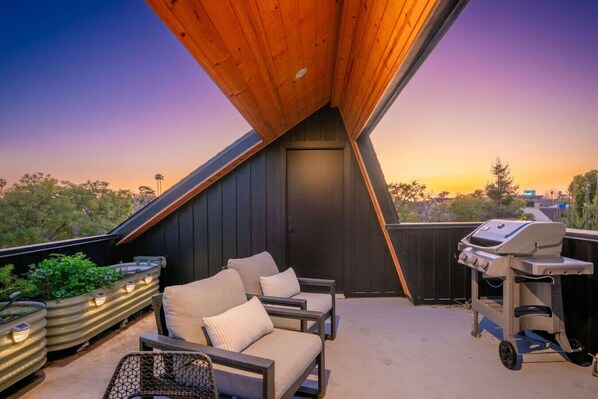 A spiral outdoor staircase leads to our stunning roof deck, a feature that truly steals the show at this property! The deck features a table and seating for four, perfect for enjoying some wine and taking in one of LA`s iconic sunsets. It also features two comfy outdoor loungers, allowing you to experience full relaxation and serenity right in the heart of LA. There`s also a Weber BBQ grill for your use, perfect for that al-fresco meal under the stars.