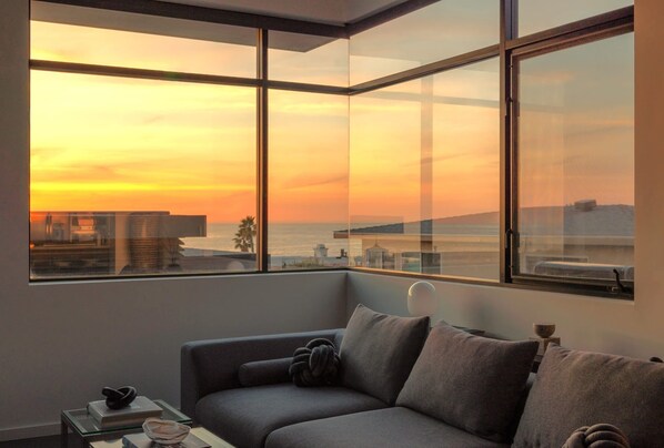 Enjoy panoramic views of the ocean from the comfort of your private balcony with comfortable seating situated just a block from the beach and two blocks from the bustling heart of downtown Manhattan Beach.