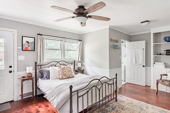 The front bedroom features a king sized memory foam bed, closet, casual chair with ottoman and access to the large front porch.