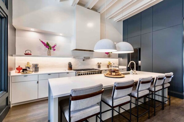 The three main entertainment spaces (Main room, Kitchen, and indoor courtyard) feature large scale art, decor and dining fair. Also a 65’ Samsung Frame TV provides an immersive art and television experience. Great spaces for small band set up, DJ set up, office parties, or other small events.
