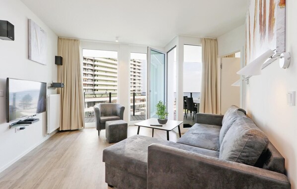 Your vacation apartment is located on the 4th floor of the complex, which is why you can enjoy a unique view. From here you can look over the town, the promenade and the beautiful sandy beach to the Baltic Sea. All rooms are furnished in Scandinavian style and are bright and flooded with light due to the floor-to-ceiling windows. A crib can only be placed in the living room, as there is not enough space in the bedroom.