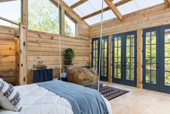 Nestled in the heart of the Big Thicket, Naturalist Boudoir TOO cabin offers a secluded retreat. Immerse yourself in nature's symphony, unwind with an outdoor hot tub and shower, or simply listen to owls hooting and migratory birds singing.