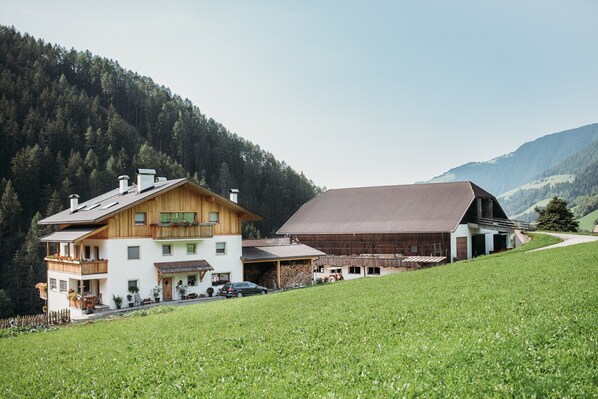 The cosy and lovely furnished apartment “Lahnbach Großkarneid” is located on the holiday farm “Großkarneiderhof”, located in the mountains outside of Lüsen (Luson), a little town in the scenic Lüsner Valley (Val di Luson) in South Tyrol. The 55 m² apartment consists of a living room with a sofa bed for 2 people, a well-equipped kitchen with a dishwasher, 2 bedrooms as well as one bathroom and can therefore accommodate 6 people. Additional amenities include Wi-Fi, satellite and cable television, a children’s bed and a highchair (both on request). You can start the day with coffee on the balcony with seating furniture and enjoy the fabulous views of the surrounding mountains. The communal outdoor area comprises a garden for you to relax in the sunshine and the stunning panorama. For children, the farm also had a little playground area. Furthermore, the holiday farm with cows, calves, chickens and a dog, features a herb garden and grows its own fruits and vegetables. After a 20-minute walk (1.5 km) to the centre of Lüsen (Luson), you will find shops, supermarkets, bakeries, a library, cafés and restaurants. Cable cars as well as numerous popular skiing areas are in the immediate vicinity and only a short drive from the apartment. In the charming town of Brixen (Bressanone), a 25-minute drive (16 km) from Lüsen (Luson), you can explore the fine local cuisine, go shopping or experience the museums and cultural offerings. South Tyrol’s vibrant capital city of Bolzano (Bozen) lies a one-hour drive (55 km) southwest of Lüse (Luson).