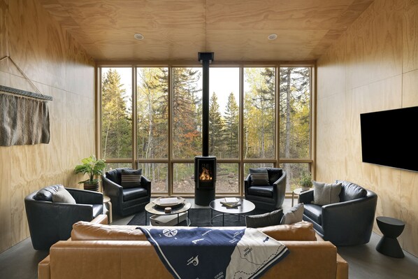 Nestled in the woods, these modern Scandinavian-style cabins offer a cozy retreat with expansive window views of the North Shore Boreal Forest. Each cabin sleeps 8-10 people and features a full kitchen, gas fireplace, private sauna and changing room detached from main cabin.