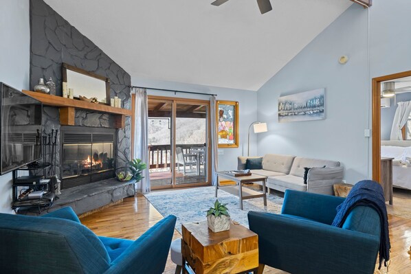 Have a meal on our upper-level deck or enjoy a cocktail while grilling in the quaint “bistro-lounge” area on the lower-level — all while listening to your favorite tunes on our portable Bluetooth speaker. Or, simply sit by the fireplace watching our 4K TV (there is also a TV in two of the bedrooms).