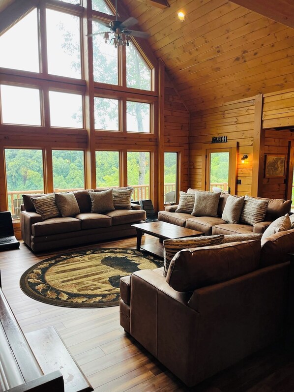 Serenity Mountain Retreat is a beautiful sprawling cabin located on over 500 private acres sleeping 18 people. Set between two mountain peaks, this beautiful cabin has all that you will need during your visit to the Great Smoky Mountains. The view from the great room is outstanding with the floor-to-ceiling windows, and a comfortable wrap around sectional sofa facing the gas fireplace and larger screen satellite TV.