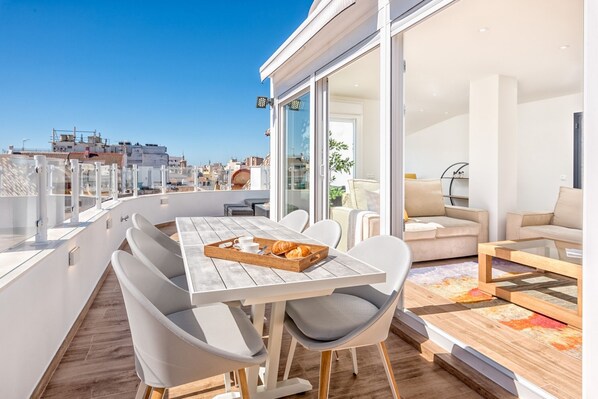 The living room features a spacious relaxation area with a two-seater sofa and a large window with access to a sunny terrace equipped with outdoor dining furniture and a charming lounge area with outdoor sofas. Next to it, there is a perfectly integrated and fully equipped kitchen to meet your needs, as well as access to the three bedrooms, all equipped with single beds.