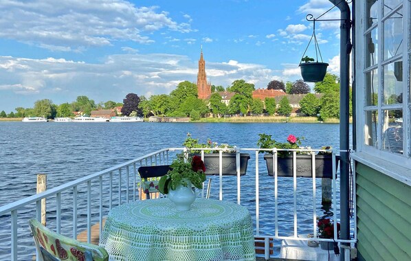 Idyllically situated directly on Lake Malchow, this holiday home for two people is located on the owner's 700 square metre residential lakeside property. The centre with harbour, the famous swing bridge, cafés, restaurants and shopping facilities is only a few steps away, the beautiful bathing beach at the Fleesensee is approx. 2 km away. 50 square metre, centrally heated non-smoking house has a large living room (upholstered furniture, extra bed for two people, flat screen TV, stereo, dining area), a small kitchen (electric hob, fridge, mini oven, various small kitchen appliances), a bedroom (double bed), a bathroom (shower, WC, hairdryer) and a hallway. There is also a furnished terrace, barbecue, sun loungers, seating on the jetty, cot and W-LAN. Boats can be moored at the jetty. A public car park is approx. 2 minutes' walk away and the total price includes final cleaning, electricity, water, bed linen and towels. To be paid on site: Tourist tax. Pets are not allowed in this property.