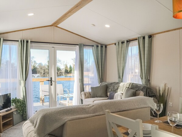 Waterfoot Lodge, nestled in the tranquil Brickyard Lakes, offers a serene lakeside retreat. Enjoy an inviting open plan living space with French doors leading to decking and stunning views of the lake. Take advantage of a well-equipped kitchen and comfortable seating area.