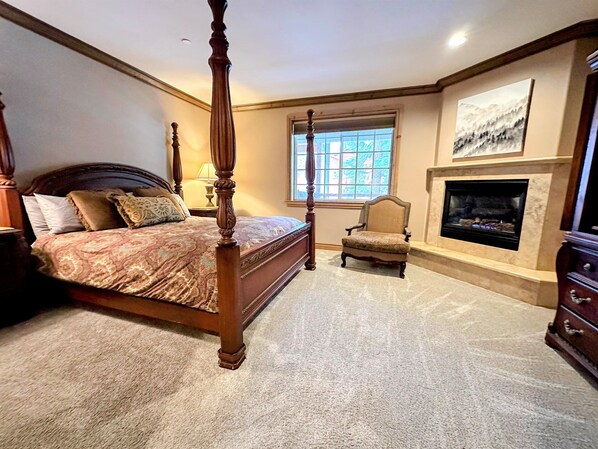 * Large, private main master bedroom features a California king bed; gas fireplace; en suite bathroom with tub/shower and dual sinks