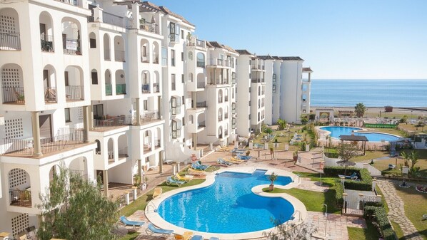 Overlooking the ocean and two communal pools, this beachfront apartment offers a relaxing retreat. Unwind on the sun-kissed terrace or stroll to the nearby marina. With air conditioning, a fully fitted kitchen, and WiFi in communal areas, you're sure to feel at ease.