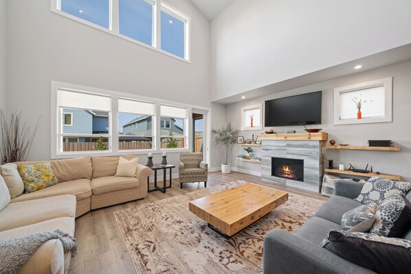 This stunning 4-bedroom, 3-bathroom home is a testament to modern elegance and comfort. As you step inside, you'll be greeted by a spacious, light-filled living area adorned with a gorgeous stone gas fireplace, perfect for cozy evenings after a day of beachcombing. Sink into the plush sectional couch or leather chairs and unwind while enjoying your favorite shows on the Smart TV with Apple TV for streaming and live TV channels.