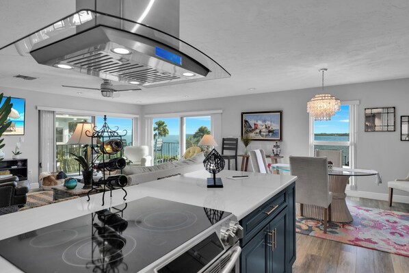The spacious living room leads to a large deck, where you can relax and take in breathtaking panoramic views of the Gulf. The updated kitchen is complete with high-end appliances, a stylish backsplash, and a breakfast bar with seating for four, making it ideal for hosting or preparing meals while gazing out over the water.
