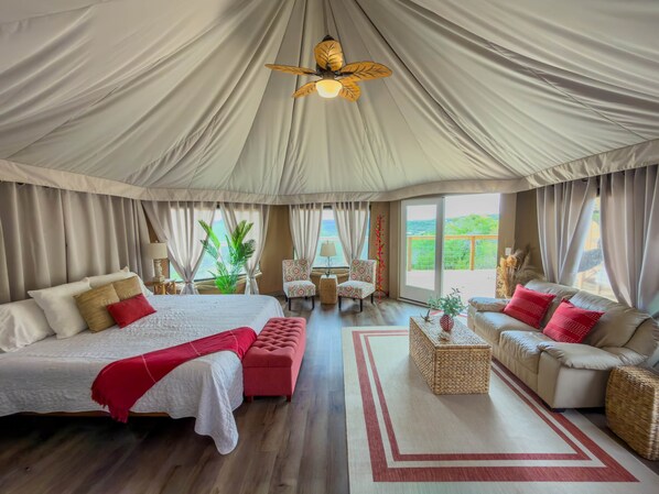 My husband and I were very happy with our stay. The tent was perfect giving a taste of camping with a luxurious feel. The king bed was super comfortable & we had excellent weather and a clear evening to watch the stars on our private balcony. Can’t wait to come back!