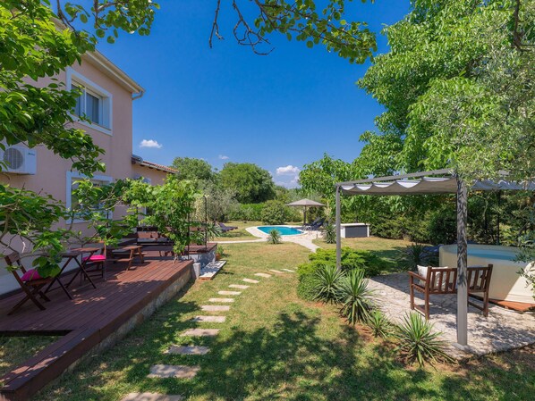 Marčana 11 km from Pula: 2-family house "Gea", 2 storeys. In the hamlet Veliki Vareški 5 km from the centre of Marčana, 18 km from the centre of Pula, 4.5 km from the sea, 4.5 km from the beach, in the countryside. Private: property 1'500 m2 (fenced) with lawn and wildlife garden, swimming pool (24 m2, depth 135 cm, seasonal availability: 29.Apr. - 21.Oct.). Outdoor shower, hot tub, volleyball, badminton, volleyball court, terrace, garden furniture, barbecue, children's playground (slide). In the house: internet access, sauna, washing machine. Parking at the house on the premises. Shop 3 km, restaurant 2.5 km, bus stop 5.1 km, pebble beach 4.5 km, rocky beach 4.5 km.