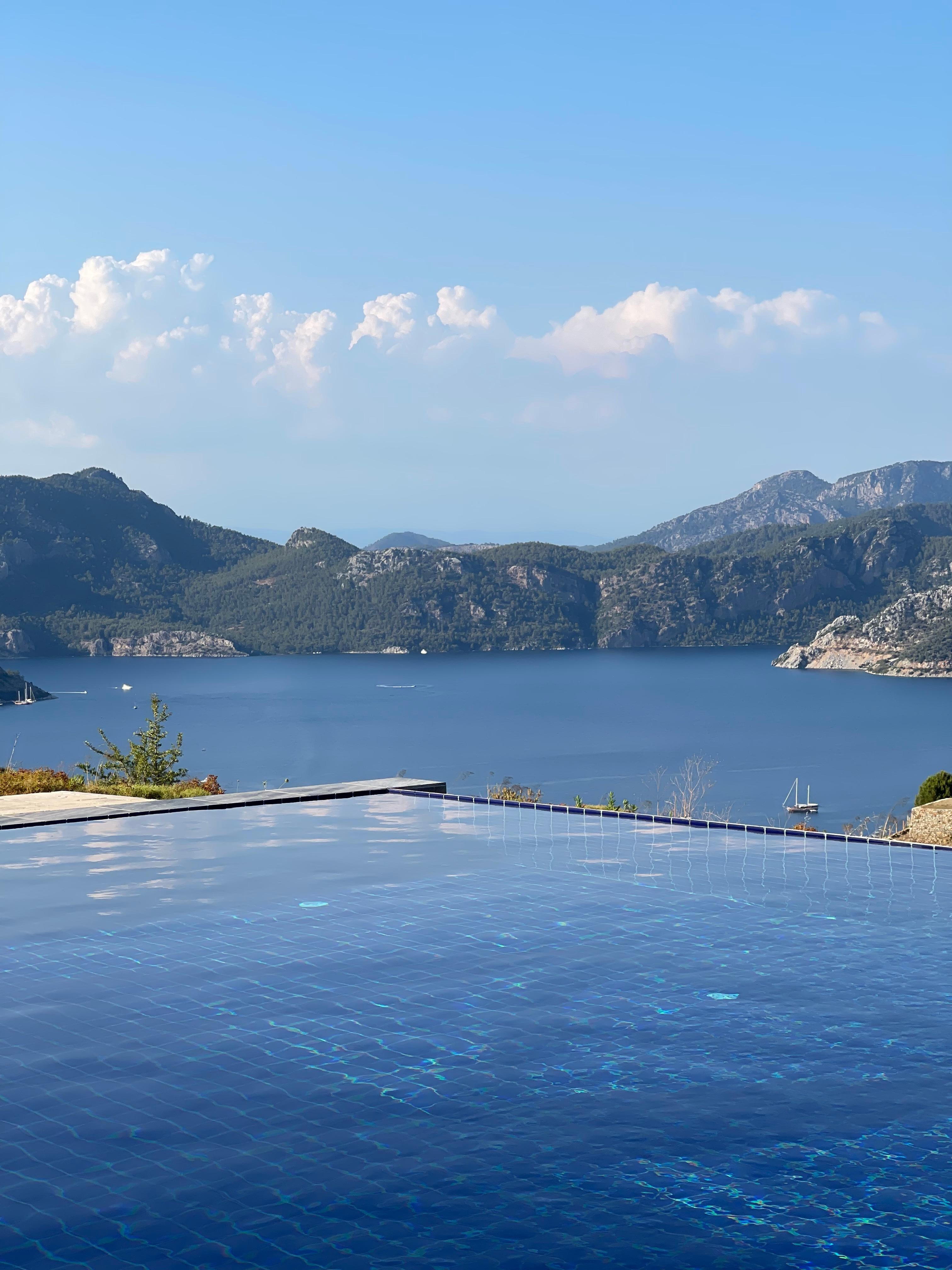 Guests soak up sunshine by the infinity pool with stunning views at this Turkish retreat where hospitality makes everyone feel right at home