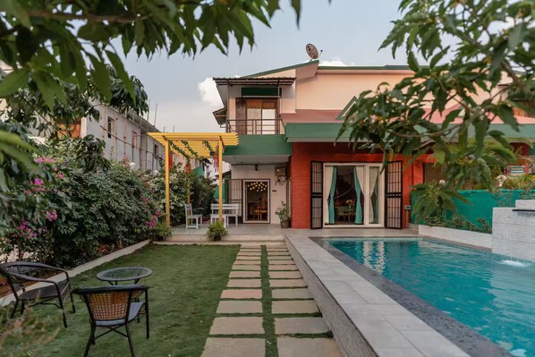 Private open to air swimming pool -Dimensions - 22ft x 10 ft and 4.5 ft in depth - Pool is cleaned every morning at 11 AM. Chlorine/bleach/alum added as needed depending on pH. - Plant leaves and twigs can fall into the water through the day. Cleaning net available (you can either request our staff to clean it or do it yourself) -During rains, water may change color temporarily and turn cloudy— this is natural and outside our control.