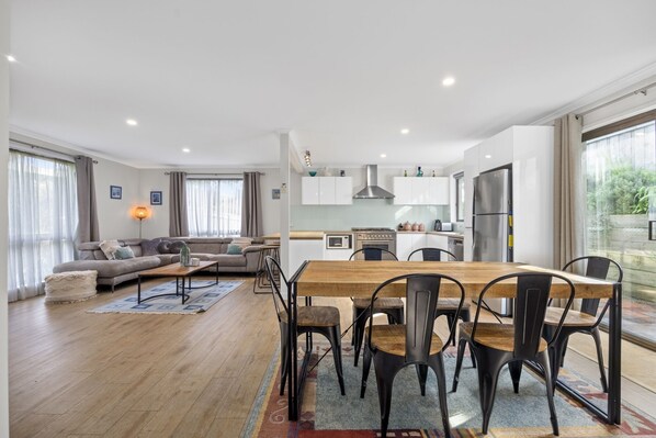 The open plan and renovated kitchen with all modern appliances including large oven & 6 burner cooktop, living and dining area features a huge smart TV, split heating & cooling unit, euro laundry, its stays lovely & cool as its solid brick and there is a security screen door and large glass sliding door that leads to the outdoor area (no flyscreen on this).