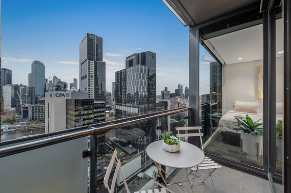 The second bedroom is large, with floor-to-ceiling windows and excellent views of their own. Each bedroom has hotel-style beds which can be split into two singles, so you have a choice of a king bed or two single beds in each bedroom, subject to the timing of request.