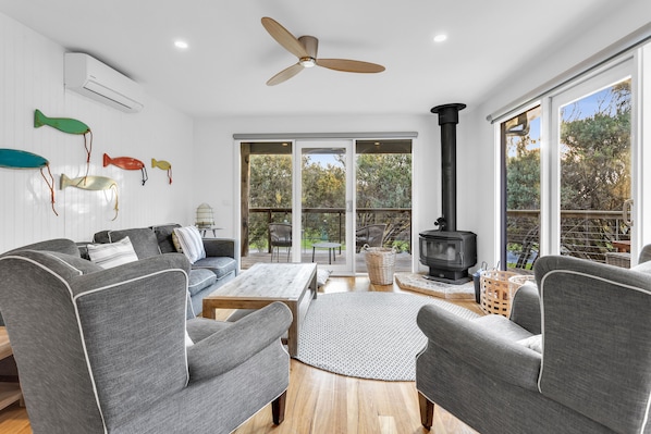 Escape to a tranquil coastal haven at Sandy Hills Beach House, where spacious living areas seamlessly connect to a generous entertaining deck. With sprawling indoor and outdoor spaces, unwind by the cozy fireplace or enjoy alfresco dining on the covered balcony. A perfect blend of relaxation and rejuvenation awaits in this five-bedroom holiday home.