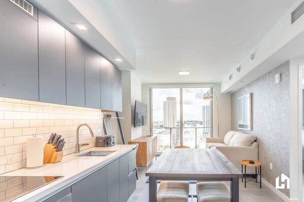 ▪️Kitchen & Dining: Fully equipped kitchen and a high-top table that seats 4 when you're cooking at home.