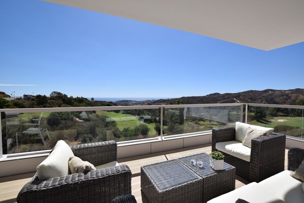 Ready for a luxury holiday in a peaceful oasis on the Costa del Sol? This modern holiday home, set within a secure complex, offers access to a communal pool, sauna, and gym-perfect for relaxation and rejuvenation. From the spacious terrace, enjoy stunning views of the golf course and the sparkling sea, starting each day in style. Ideal for families, couples, or groups of friends, this golfer's paradise provides comfortable and stylish accommodation. Nestled between the natural beauty of the Sierra de Mijas and the Mediterranean, the property is surrounded by three prestigious golf courses in La Cala de Mijas. Located between Málaga and Marbella, it's just a convenient 25-minute drive from the airport. The open-plan layout features a sleek, fully equipped kitchen that overlooks the bright living room through sliding glass doors, seamlessly connecting to the south-facing terrace. Each bedroom includes its own bathroom with spacious walk-in showers for added comfort. After a day on the beautiful golf courses or exploring the region, unwind in the wellness area or take a dip in the pool. For convenience, secure parking is available under the building, making this home an ideal base for an unforgettable Costa del Sol getaway.