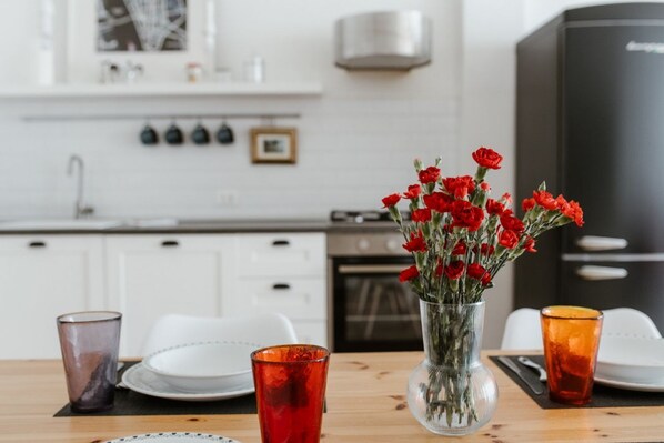 - KITCHENETTE with gas stovetop, refrigerator, freezer, oven, moka pot, kettle, wine glasses, and various kitchen utensils;