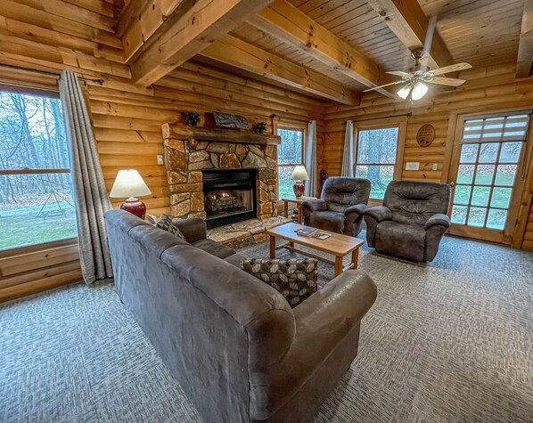 Escape to the secluded beauty of Shady Maple Cabin, a genuine log cabin located on the edge of the woods. Relax in front of a natural gas fireplace, unwind in a whirlpool tub or step outside to an outdoor fire pit and grilling tripod.