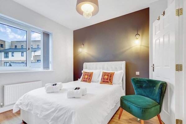The house is set over 3 floors. The ground floor has a kitchen, dining area with a view of the 65'' TV, breakfast bar, WC, snug room and a private garden.