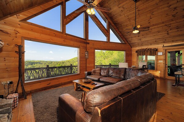 Escape to the Blue Ridge Mountains and unwind at Majestic View, a luxurious cabin surrounded by breathtaking mountain views. Relax in the hot tub on a covered deck or cozy up by the wood-burning fireplace. Inside, enjoy an open concept main floor with a gas fireplace, custom kitchen cabinetry, and granite countertops.
