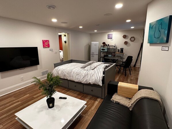 Uptown Minneapolis's hidden gem awaits you. This stylish lower-level unit, near Lake Bde Maka Ska, offers artistic touches and modern comforts like a fireplace and central air conditioning. A full bathroom is at your disposal while essentials for coffee, tea, microwave are available to kickstart your day.
