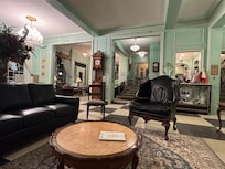 Travelers can warm up by the inviting fireplace after browsing local shops, then enjoy satisfying meals at this charming inn in the shopping district