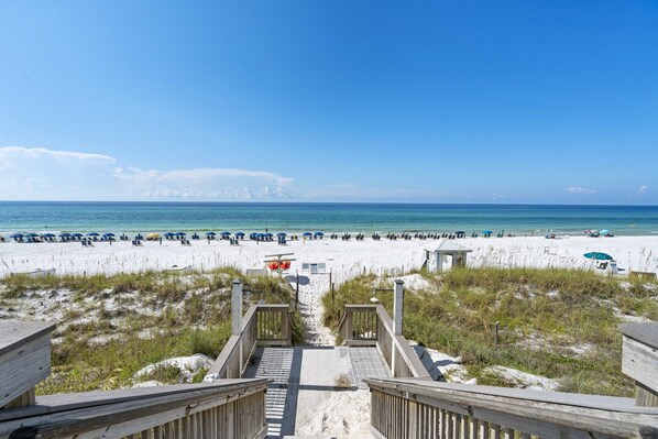 Private Beach Access: A private boardwalk provides easy access to the white sand and emerald waters of Miramar Beach.