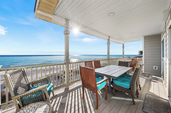 Cape Monaco, a beachfront home, welcomes you with its unique 'Beachy Elegant' style. Unwind on the spacious deck with Gulf views from Seagrove Beach to downtown Destin or relax in the great room surrounded by European/American traditional furniture and oriental rugs.