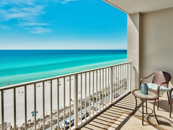 This unit is ideally located on the 9th floor, on a corner, giving our guests unobstructed panoramic views of the white sand beach and emerald blue gulf.