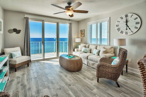 Enjoy stunning Gulf views at Majestic Sun 1112B from this 11th-floor corner vacation rental condo during your next vacation in Miramar Beach, FL. The photos will never do it justice. Walking into the main living space, windows line the Western gulf view and wrap around to the sliding patio doors highlighting the Southern full front gulf views! The large patio is the perfect spot to watch the dolphin play in the morning or experience a gorgeous sunset in the evening.