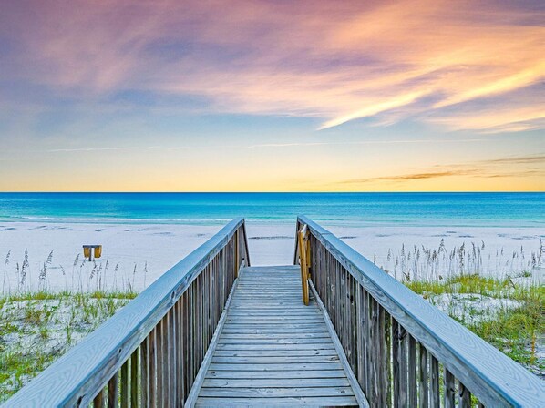 There are 4 guest bedrooms, a laundry area, a Gulf-front pool, and direct access to a private dune walkover leading to the beach on the second floor. A guest bedroom with a king bed and a private bathroom with a shower has French doors that open to the balcony, pool, and dune walkover. A second guest bedroom also has a king bed and shared bathroom with shower, but this bedroom enjoys views of the pool and the beach through its French doors. A third guest bedroom has a king bed and a private bathroom. A fourth bedroom has a king bed, a private bathroom, and shares a balcony overlooking the neighborhood with the third guest bedroom.