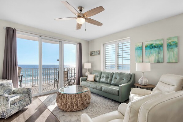 ✹ Living Room - Features Gulf Views, Balcony Access, Leather Sleeper Sofa, and Leather Recliners situated around a large Smart TV - Plenty of seating for your whole group!