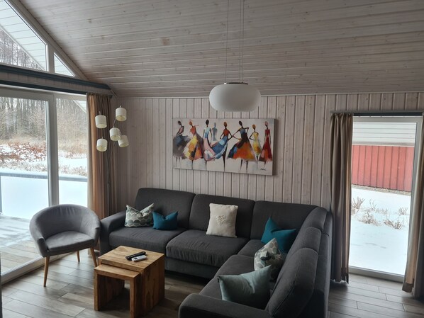 TV, fireplace - Seeschwalbe Classic 318 - Großzügiges Ferienhaus mit Eigener Sauna und Whirlpool (Mirow)