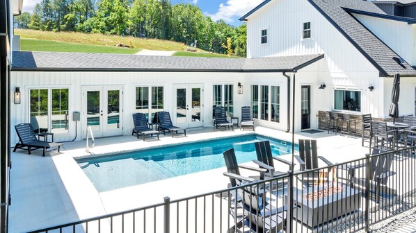 Come enjoy the best kept secret in VA and see what Smith Mountain Lake has to offer at it's only 9-BEDROOM luxury waterfront vacation getaway! Brand new in 2024, Tranquil Shores Estate sits at the best location on the lake, overlooking beautiful SML a few feet from the water's edge. The home features a main 7-bedroom home and 2-bedroom guest cottage along with a private large SALT WATER HEATED POOL and Hot Springs 8-person HOT TUB. The home comes fully loaded with a large pool deck veranda overlooking the lake along with a GAS FIRE PIT, PRIVATE DOCK and luxury living with a spacious, open vaulted floor plan with large covered decks and windows overlooking the lakefront providing abundant natural light and views. Ready to handle any size vacation, featuring 9 bedrooms and 7.5 bathrooms, with easy lake and road access to many restaurants, wineries, marinas, state park hiking trails, kids activities, parks, etc, all within a few miles of the home. Ideal for large groups both indoor and out with huge covered decks and breathtaking panoramic lake views.