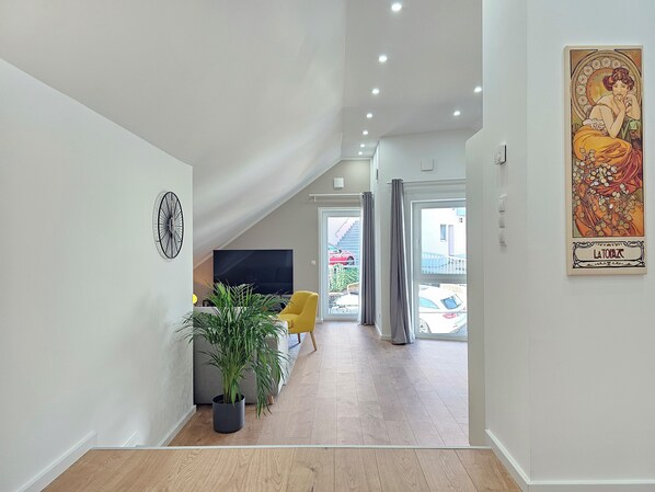 The apartment is stylish but also practically furnished. You will find a number of extras here that far exceed the standards of normal holiday apartments. The heart of the apartment is the cozy living room with adjoining dining area. A comfortable sofa bed offers enough space for large groups. You will also find a smart TV with a sound system and plenty of streaming options, as well as a Switch with a varied selection of games. Here you can relax in a beautiful ambience or argue over a multiplayer game. Real plants and great attention to detail make the apartments a lot more homely than other accommodations.