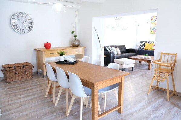Kitchen and dining area (25 m²) equipped with a fridge, a 3-burner ceramic hob, an oven, a microwave, a dishwasher, a toaster, a kettle, a Nespresso coffee machine and a filter coffee machine.