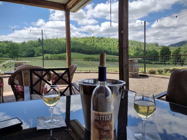 Lowest rate in the area. Welcome to the "Mountain Cabin Getaway!" with only a 2-day minimum. 10% DISCOUNT for weekly bookings, also. Dogs welcome of any size! It is a cabin with 2 master suites and 2 full baths, one on each side and a large living room with adjoining kitchen and dining room in the center of the house with a gas fireplace and a bar. High-speed fiber optic internet! 3 TV's - 1 in each bedroom and in the living room. Dedicated work desk for working from "home." You can use your cell phone through the WiFi by just changing your phone settings to make and receive calls through the WiFi, which works like a charm for us if your carrier isn't as good in the mountains. Murphy is a wonderful mountain town nestled between Blue Ridge, Blairsville and Helen, GA which are all within 30 minutes to an hour away. You can even do Gatlinburg or Pigeon Forge, TN for a day trip and we are less than 20 minutes from where the Tennessee and Georgia state lines meet at the quaint shopping and dining village on the Toccoa River where you can cross from Copperhill, TN into McCayesville, GA within a few steps on Bridge St. We are also within 20 minutes of Harrah's Valley River Casino, and too many Appalachian hiking trails and rafting locations to list. There are many lakes surrounding the area and nature abounds with deer coming out to graze in the grass and say welcome to Murphy! After a fun day you can sit around the fire pit and enjoy a bottle of complimentary wine from our bar.