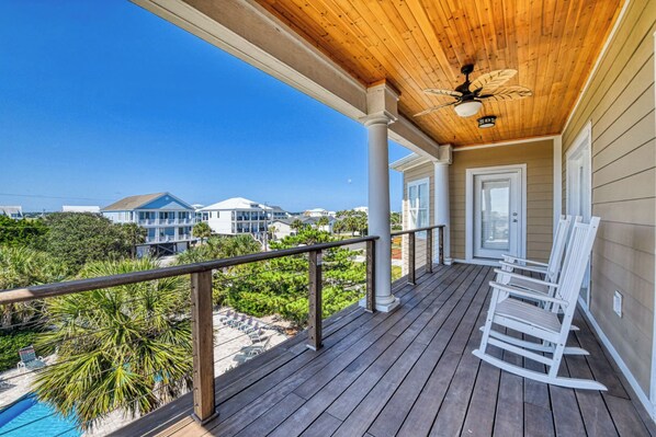 Rating Details: The property manager was very helpful. The vacation rental was spotless. I was very happy with the location. I was more than satisfied with the condition of the vacation rental. Overall, I recommend this vacation rental. Reviewer Comments: This house was perfect for our multi family stay. House has a great flow, large rooms and beautiful pool. Located across the street from the beach and beach access. Kitchen was well equipped. Large family room with plenty of seating. Perfect porches with comfortable sitting on the front and back. Wine/drink fridge and ice maker were nice additions. Some of the beds could use new mattresses, otherwise we loved our stay.