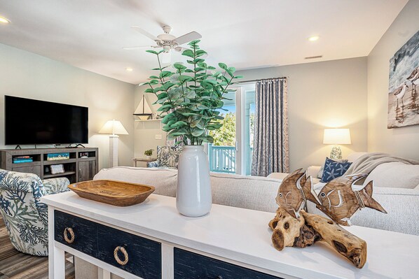 Bright, beachy, and perfect for family hangouts! The open 1st-floor living room has plenty of seating and a huge 75" SmartTV with YouTubeTV included — ideal for movie nights after a day in the sun.