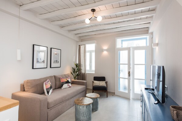 The location of the home is a true advantage that allows you to enjoy your holiday at the heart of the town. During daytime you can start your walk at the stores of the main market at Matoyiannia while later you can experience the numerous nightlife options of the town. Nearby there are all kinds of shops, restaurants, cafes, super market, and everything you might need during your vacation. Chora is a traditional village with a cosmopolitan character that impresses all visitors. In the narrow cobblestone paths you will find many shops and boutiques, as and small shops selling local products. When the night falls Chora becomes an endless party where everyone revels until the next morning. Mykonos island belongs to the complex of Cyclades and is one of the jewels of Aegean. It is located between Naxos and Tinos, while there are daily excursion boats leaving for the island in antiquity, Delos. Mykonos is one of the first islands that developed in tourism and attracted tourists from all over the world. This island is the queen of fun. Here, holidays means partying, an endless party that starts when visitors arrive at the port and ends when they leave Mykonos.