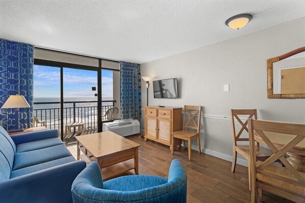 Located on the 7th floor, this oceanfront suite at is a haven of comfort and convenience. Savor a Complimentary Hot Deluxe Breakfast, then unwind in the living area or step onto your private balcony to take in the coastal views. With two flat-screen TVs, WiFi, and access to laundry facilities nearby rooftop pool you can make yourself right at home.