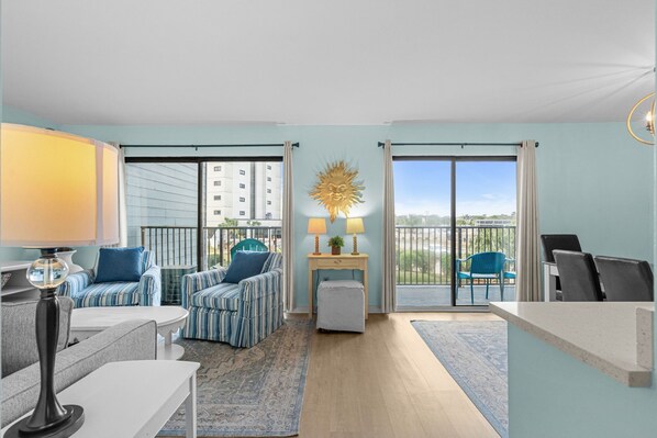 Step inside to an open-concept living area filled with natural light and coastal décor, making you feel right at home. Relax on the comfortable seating while watching your favorite shows on the smart TV or enjoy a meal at the dining table after preparing it in the fully equipped kitchen with modern appliances and plenty of counter space.
