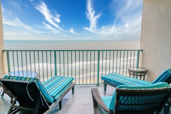 This penthouse sits on the 12th floor and comfortably sleeps up to 6 guests. It features 1 king bed and 2 queen beds, along with multiple dressers, closet space, smart TVs for streaming, high-speed Wi-Fi, two full bathrooms, and a spacious, fully equipped kitchen that makes it easy to cook and entertain. But the real highlight? The panoramic ocean views you'll enjoy from every single room, including the kitchen. Whether you're sipping coffee in the morning or watching the sun dip below the horizon, the scenery is simply unforgettable. Keep an eye out, you might even spot dolphins right from the balcony!