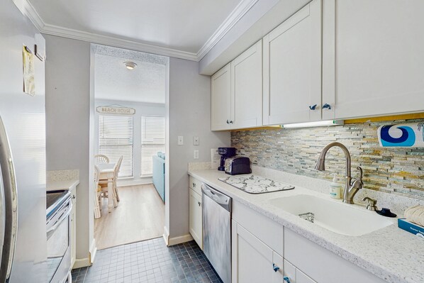 Fridge, microwave, oven, stovetop - Oceanview condo with pool, private balcony & steps to beach (Myrtle Beach)